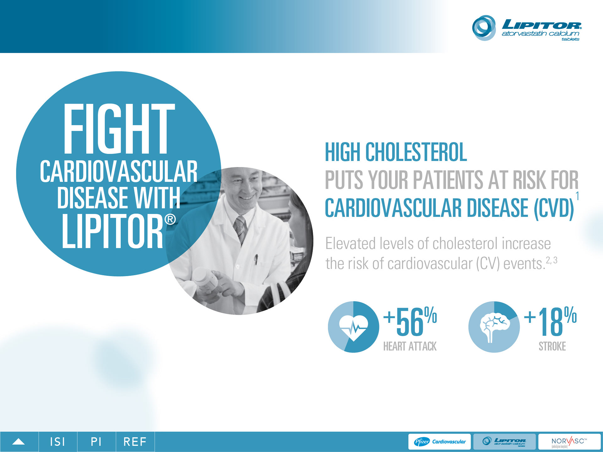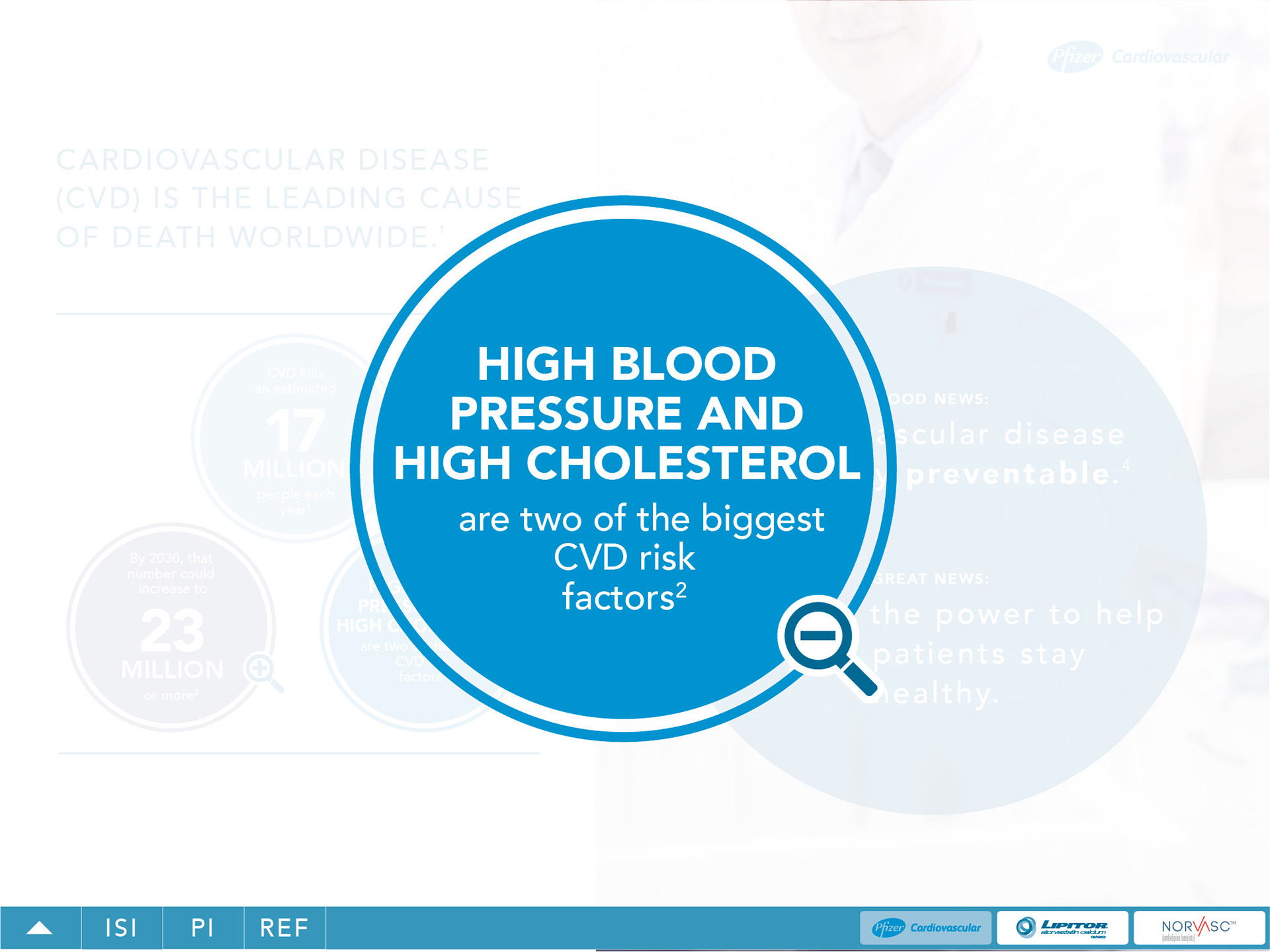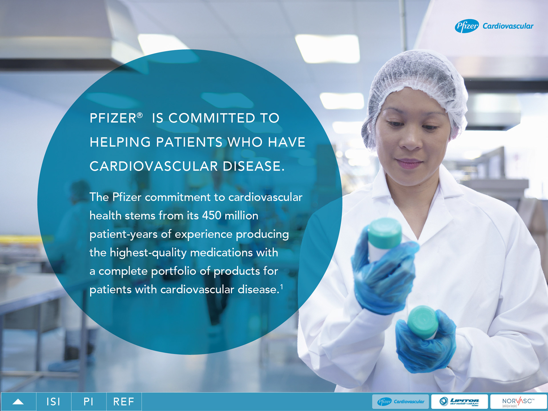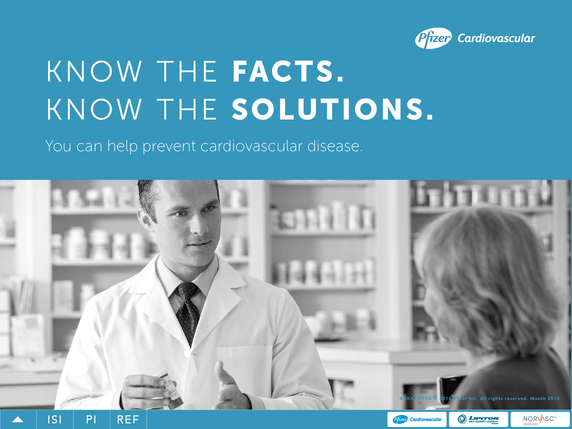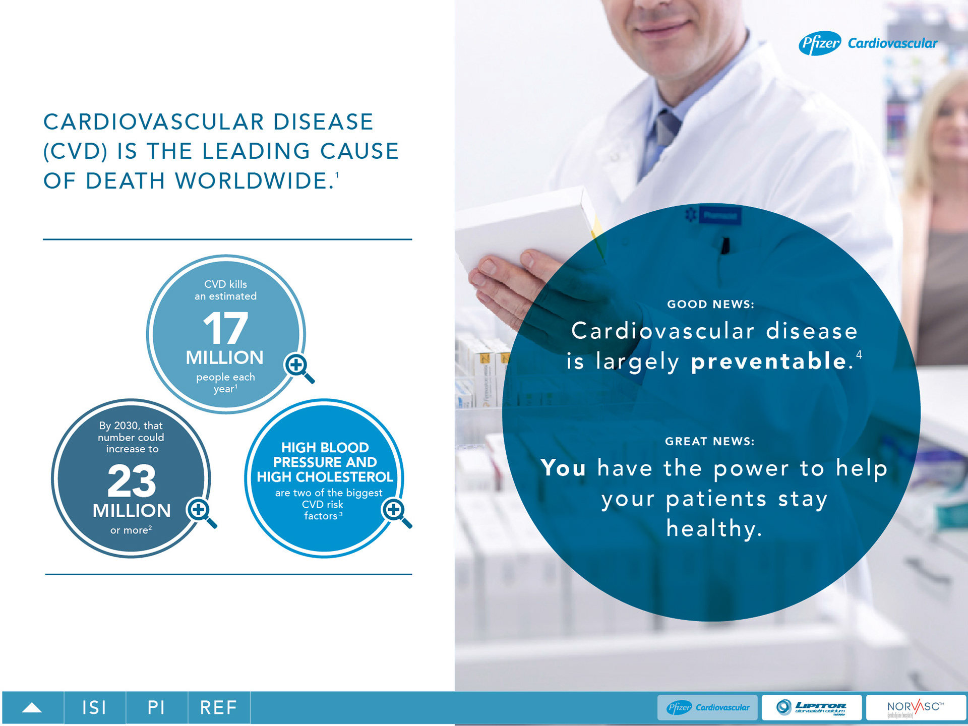 Training aid for medical professionals specializing in cardiovascular disease. Overview of cardiovascular disease (CVD) and care along with detail aids for two Pfizer medications used in treatment of CVD.