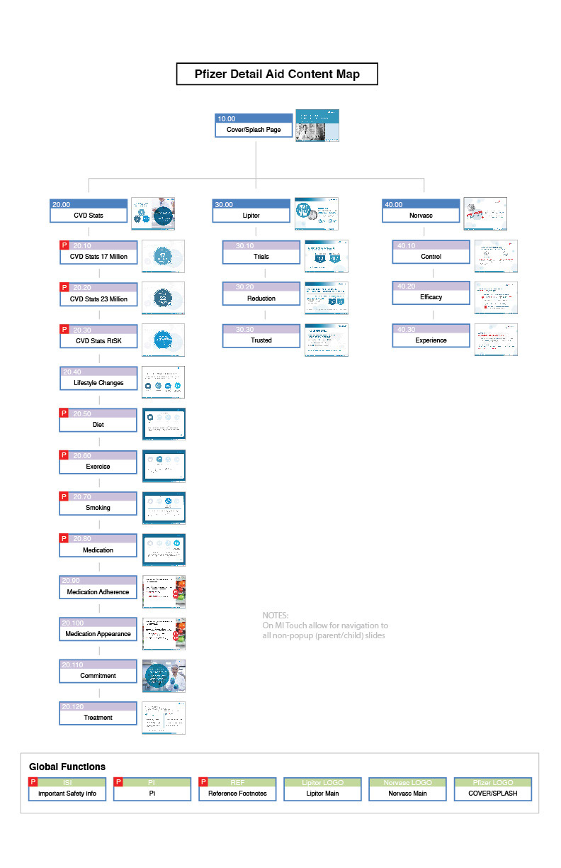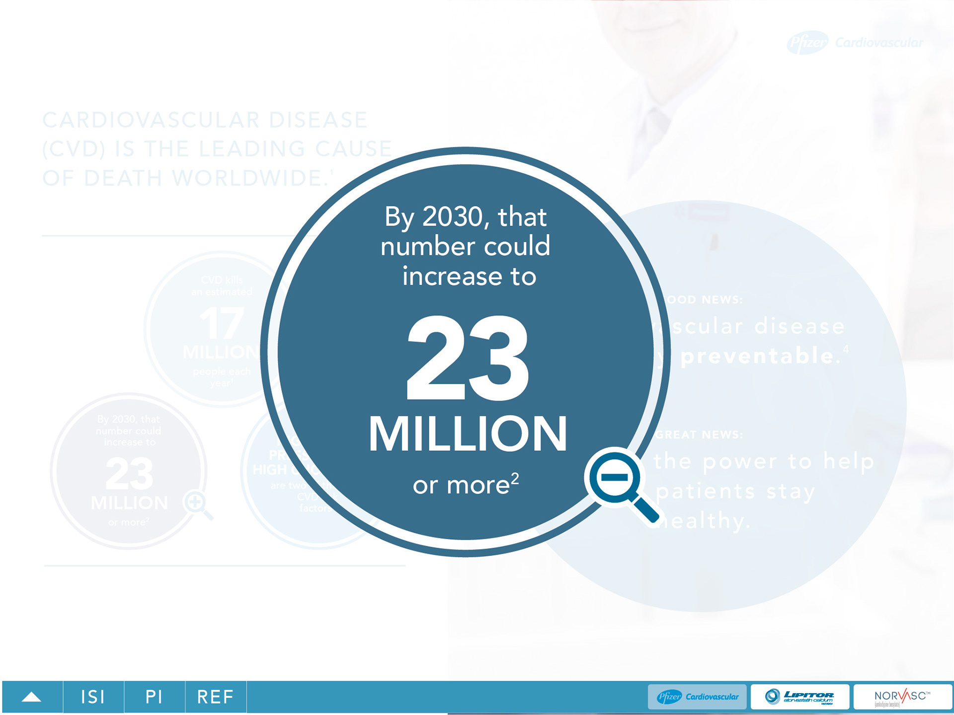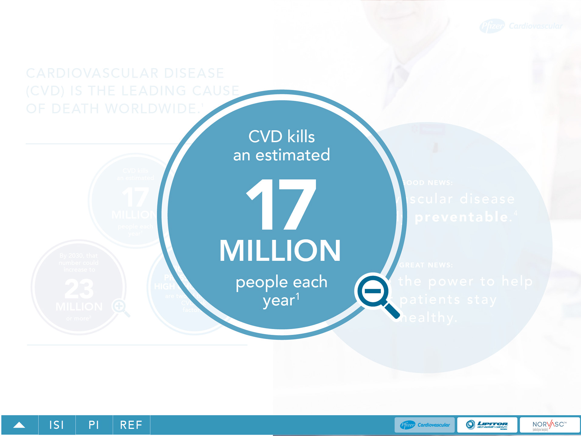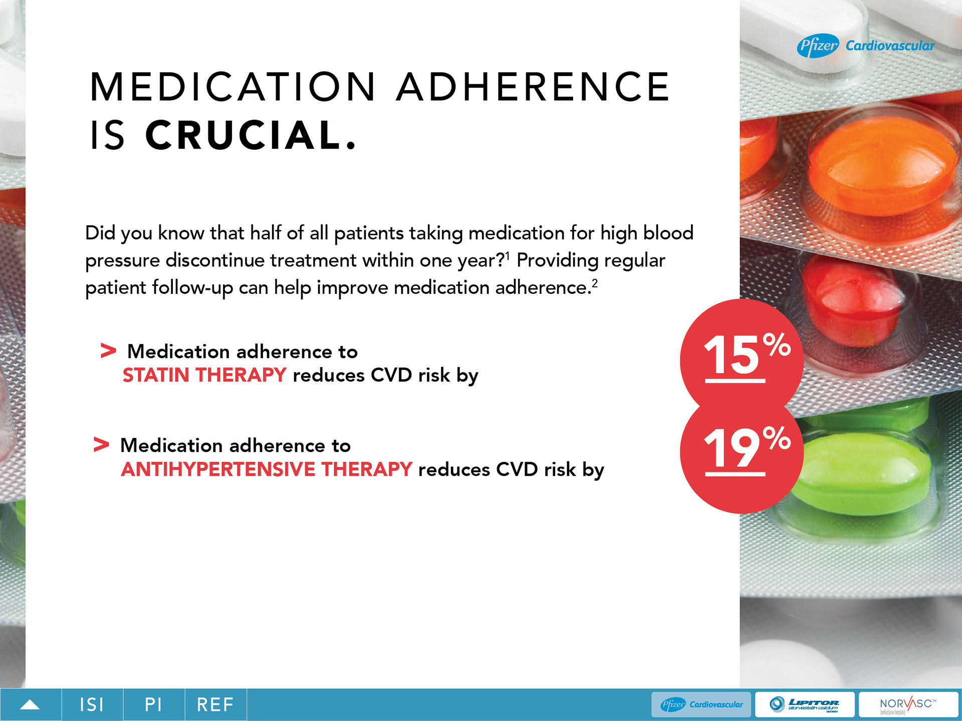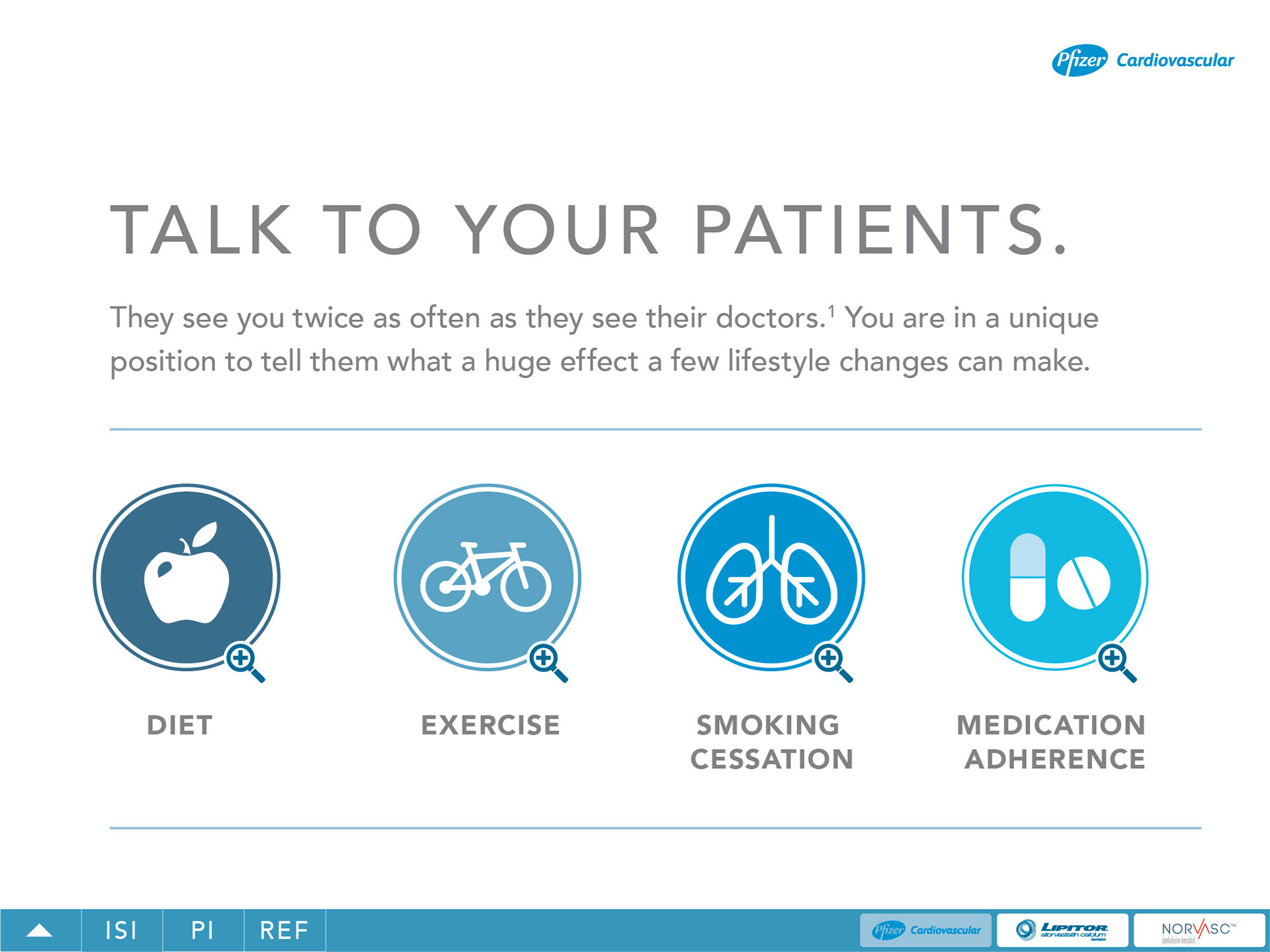 Training aid for medical professionals specializing in cardiovascular disease. Overview of cardiovascular disease (CVD) and care along with detail aids for two Pfizer medications used in treatment of CVD.